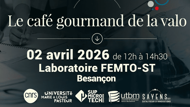 La SATT SAYENS et la Direction de la Recherche, de la Valorisation et de l'Innovation de l'Université Marie et Louis Pasteur organisent le Jeudi 2 avril 2026 de 12h à 14h30 un café gourmand pour vous présenter l'ensemble des services mis à la disposition des laboratoires et chercheurs en matière d'accompagnement au développement de vos projets de recherche, valorisation de votre savoir-faire et promotion de l'innovation.