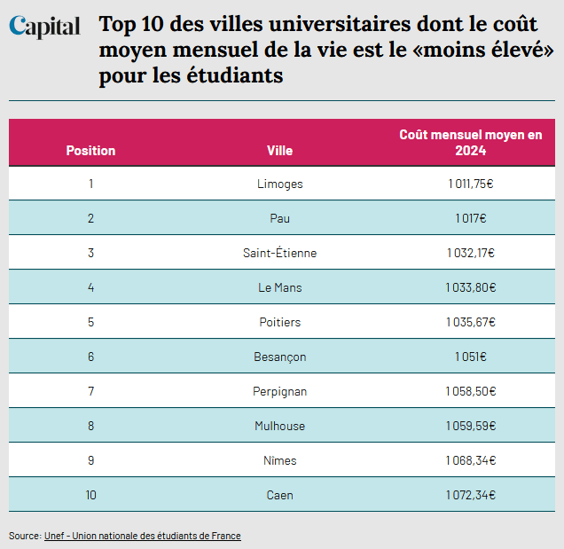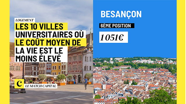 Besançon s’est hissé au 6ème rang de ce classement, faisant donc parti des villes étudiantes avec le cout de vie le moins élevé : coût mensuel moyen en 2024 : 1051€.