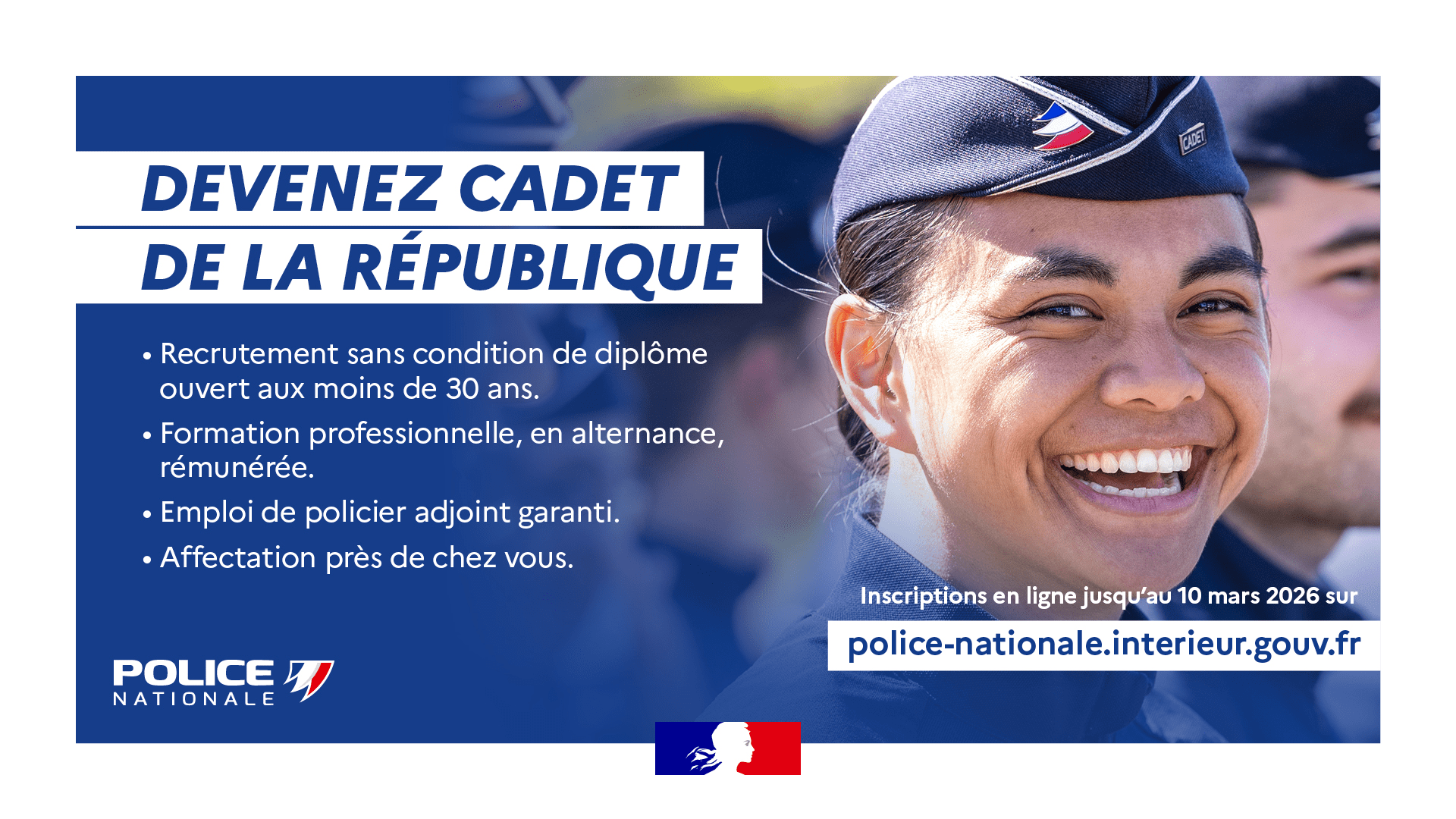 Devenez Cadet de la République : une formation, un métier, un avenir ! La Police nationale recrute sa 22ème promotion ! Vous avez entre 18 et 30 ans, vous n'avez pas de diplôme et vous souhaitez vous engager dans une carrière au service des citoyens?Le dispositif Cadet, c'est :1 an de formation en alternance (école de police, lycée, stages).552 € nets/mois d'allocation d'études.Un emploi garanti de policier adjoint dans votre département dès la fin de formation (ex:1 526 € nets/mois en IDF).Une évolution de carrière : avec une préparation spécifique pour réussir le concours de gardien de la paix. Zones concernées : DOM-COM (hors Mayotte) et départements 75, 92, 93, 94.Inscriptions jusqu'au 10 mars 2026.Rentrée : 1er septembre 2026 👉 Inscrivez-vous dès maintenant :https://www.police-nationale.interieur.gouv.fr/nous-rejoindre/nos-voies-dacces/devenir-policier/pa-cadet/cadet