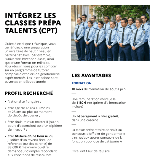 Principe des classes "prépa talents" : il s'agit d'une formation gendarmerie rémunérée (cours théoriques dans un cadre militaire) préparant au concours officier.