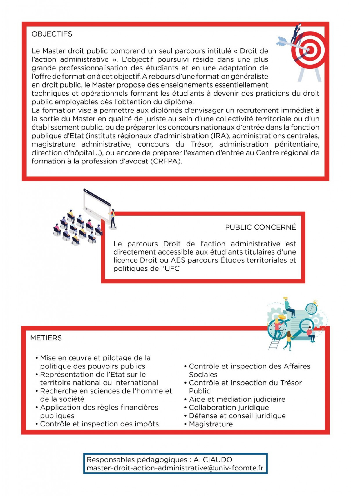 Ce master propose des enseignements essentiellement techniques et opérationnels formant les étudiants à devenir des praticiens du droit public employables dès l’obtention du diplôme. L'objectif de ce parcours est de professionnaliser et s'adapter au attentes du marché de l'emploi, pour accéder à des postes au sein d'une collectivité territoriale ou d'un établissement public.Une autre perspective qu'offre cette formation est la préparation aux concours nationaux d'entrée dans la fonction publique d'état ou examen d'entrée au Centre Régional de Formation à la Profession d'Avocat -CRFPA).Cette formation est accessible aux étudiants titulaires d'une licence Droit ou AES parcours Etudes territoriales et politiques de l'UFC.