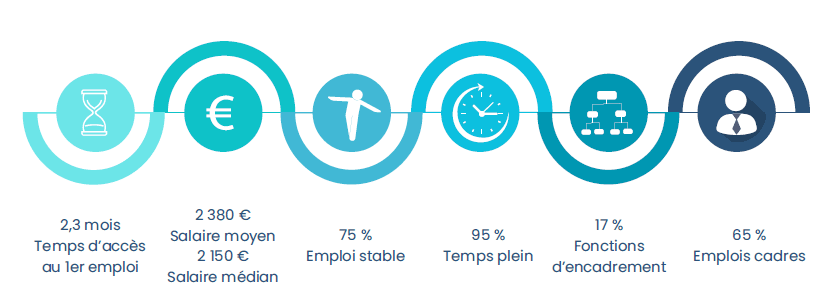 Les avis des jeunes actifs concernant les emplois qu'ils occupent sont très satisfaisants puisque 80% des diplômés considèrent avoir suivi une formation en adéquation avec leurs missions actuelles. Les données sont positives et nous assurent une bonne adaptation de nos enseignements à la réalité du marché.
