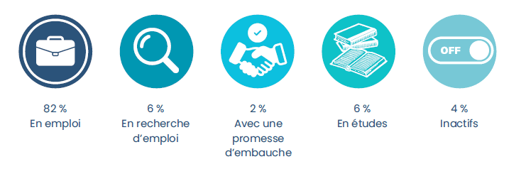 Avec un taux d'insertion professionnelle de 91%, voici le détail de leur situation professionnelle en fin d'année 2023 :