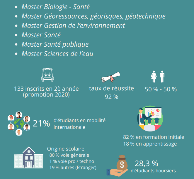 Voici les résultats de l'enquête menée par l'Observatoire de la formation auprès des titulaires d'un master en Nature et vie en 2020 à l'université de Franche Comté. Cette enquête est réalisée 30 mois après l'obtention du diplôme afin de remonter les données au Ministère.